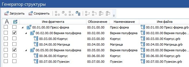 Новая команда Генератор структуры сборки дает пользователю возможность создавать и редактировать шаблон с набором фрагментов сборки, их структурой и файлами элементов, входящих в сборку, и по данным шаблонам создавать сборки.