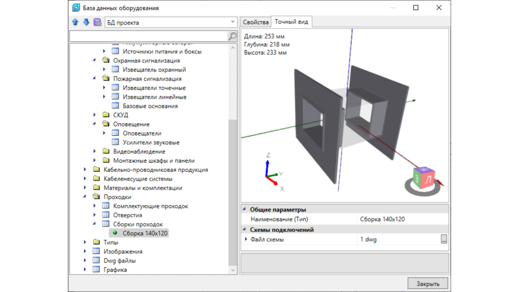 Кабельная проходка в диалоговом окне «База данных оборудования»