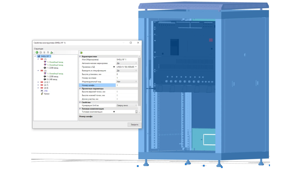 - Визуализация: формирование 3D-вида 19" монтажного шкафа и установленного в нем оборудования.