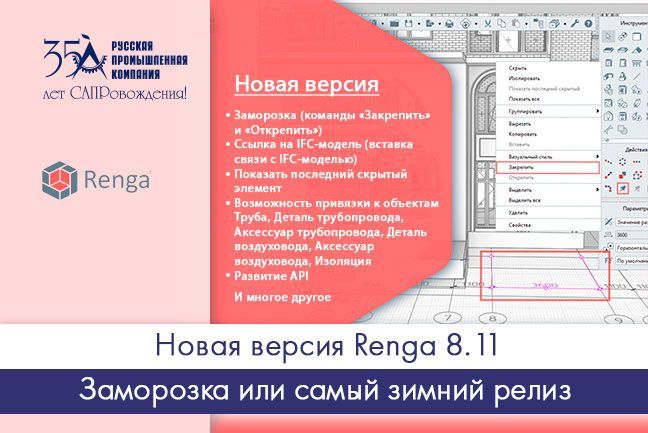 Русская Промышленная Компания – авторизованный партнер Renga Software – информирует о выходе новой версии Renga Standard и Renga Professional, в которой реализованы долгожданные пользователями возможности заморозки объектов и ссылки на IFC-модели. А кроме этого, добавлена возможность при работе с отображением модели показывать последний скрытый элемент, а также назначать цвет тексту для акцентирования на нем внимания участников проекта. Еще повышена точность в работе с инженерными сетями и продолжилось совершенствование API.