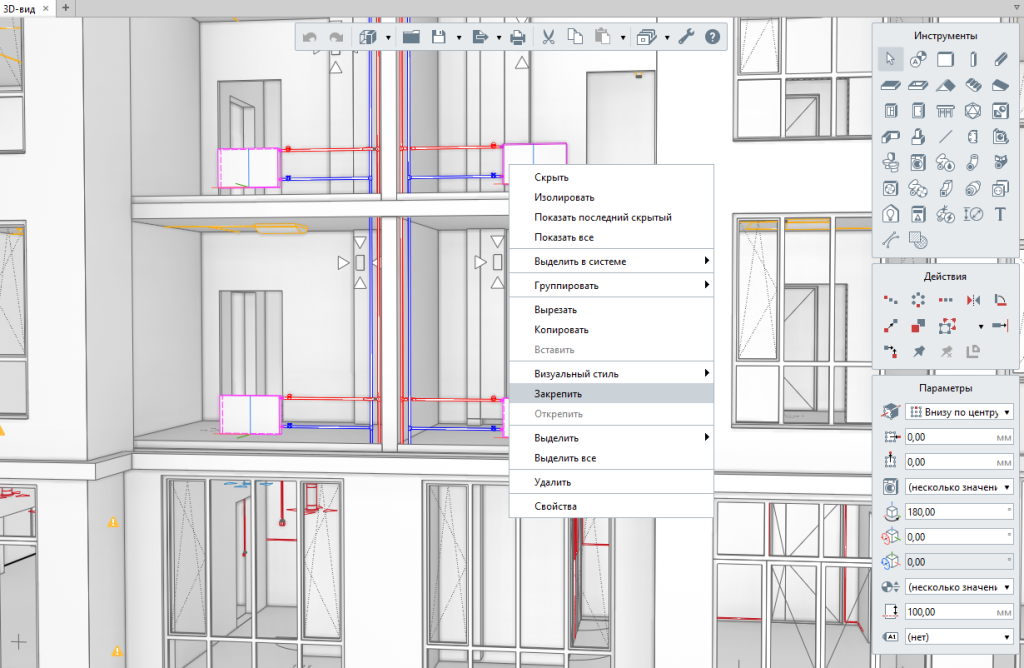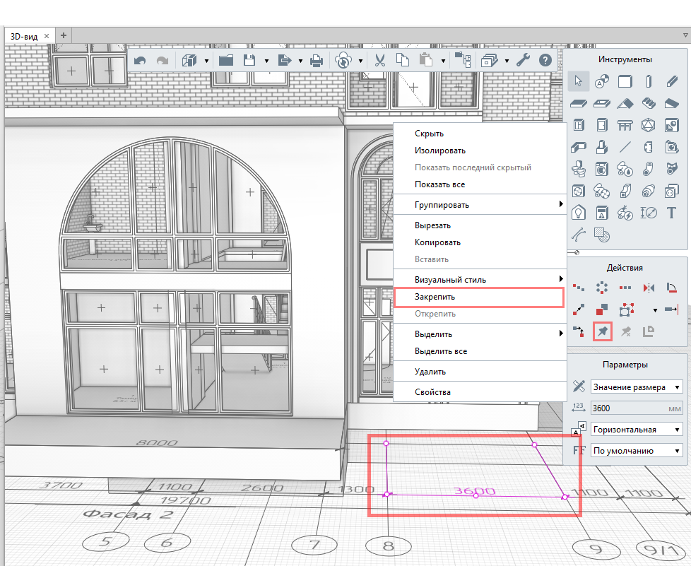 В Renga «Заморозка» реализована в виде команд «Закрепить» и «Открепить» для объектов в модели и на листе чертежа.