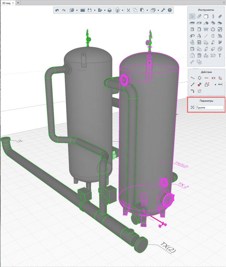 Продолжилось усовершенствование инструментов управления объектами, был расширен функционал команд «Сгруппировать», «Разгруппировать» на объекты 3D-вида и сборки. В группы можно объединять не только отдельные объекты, но и существующие группы. Это ускоряет работу и делает редактирование проекта гибким.