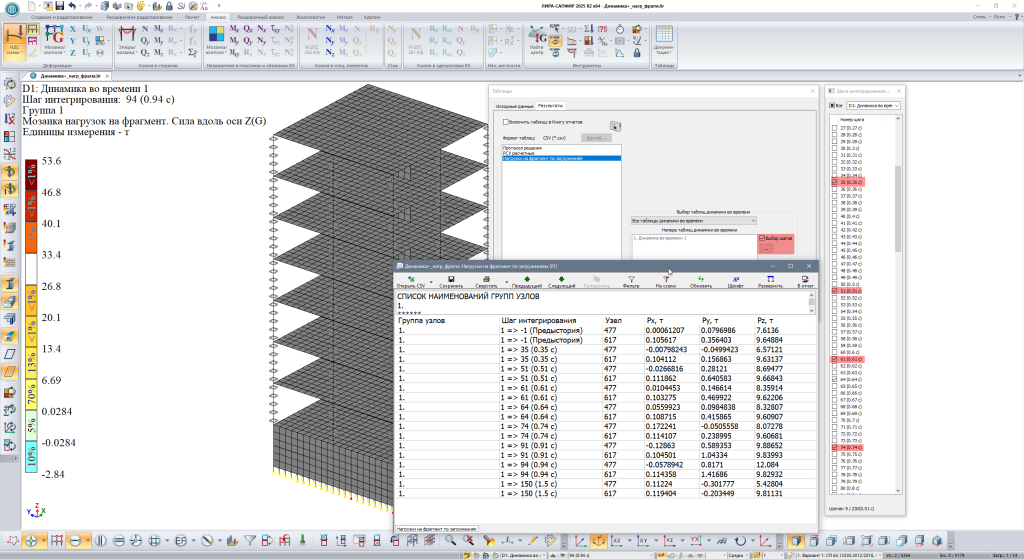 В задачах динамики во времени реализована возможность документирования результатов расчета в табличном формате для выбранных шагов интегрирования.