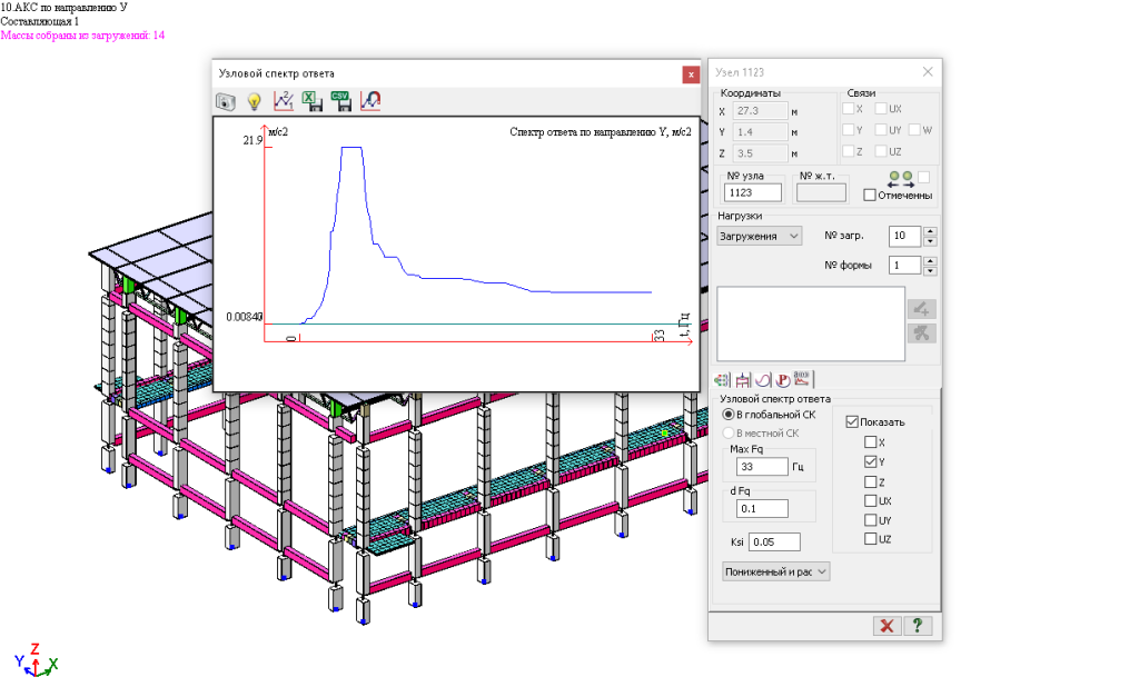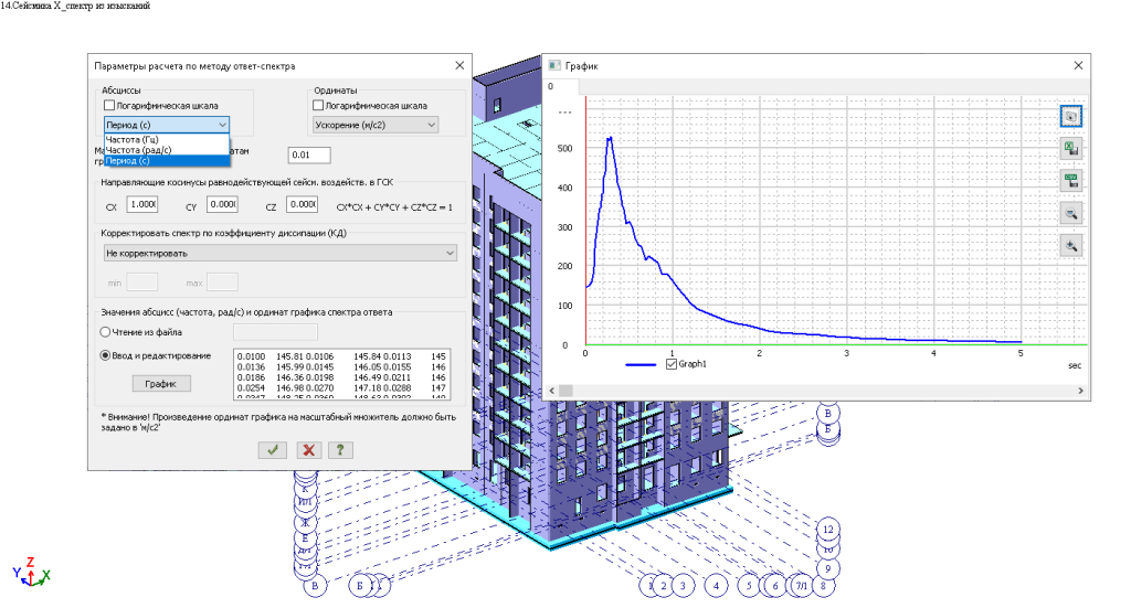 При расчете на сейсмическое воздействие, заданное акселерограммой, с использованием метода модальной суперпозиции (модуль 27) был изменен алгоритм построения графика спектр-ответ (спектр-отклик). Построение спектра осуществляется через поэтажную акселерограмму, амплитуды которой определяются через сумму псевдоускорений (произведение перемещения на квадрат круговой частоты) по формам колебаний: