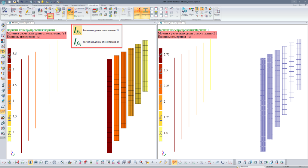 Появились мозаики расчетных длин железобетонных стержней и пластин (стен) относительно локальных осей Z1 и Y1. ВНИМАНИЕ! Высота стены определяется направлением местной оси Y1, поэтому согласованные местные оси Y1 конечных элементов оболочек, которыми моделируется стена или диафрагма с учетом гибкости, должны быть направлены вертикально.