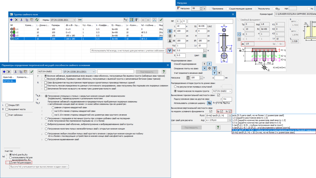 - Добавлена настройка hd, которая позволяет напрямую указать, использовать ли hd в расчете осадки для одиночной сваи и по модели куста свай (ранее эта настройка включалась опцией "использовать hd для вычисления Rx, Ry", и выключалась опцией "hd=0 для Rxy", о чем было написано во всплывающих подсказках, теперь она вынесена в отдельное управление).