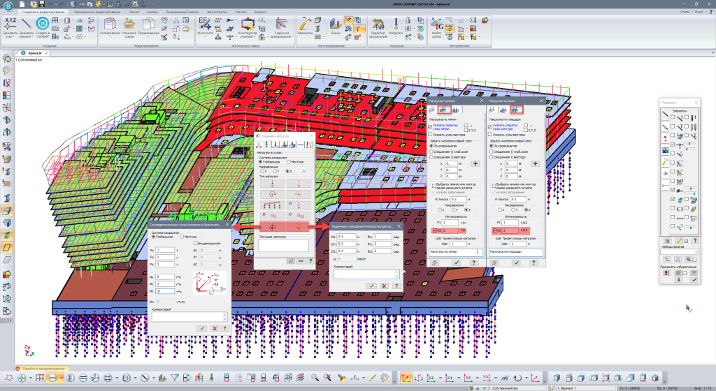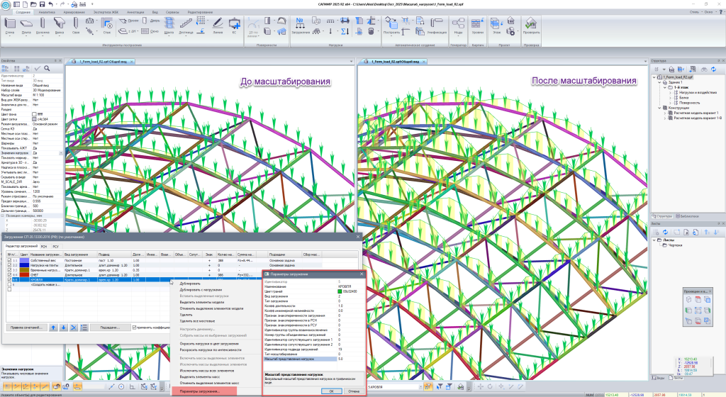 В диалоговое окно "Редактор загружений" для выбранного загружения добавлен параметр "Масштаб представления нагрузок", который позволяет изменять масштаб отображения сосредоточенных, линейных нагрузок и нагрузок-штампов, обеспечивая их более наглядную визуализацию.