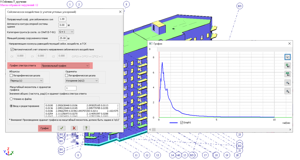 Модуль 38 - модель сейсмического воздействия с учетом кручения. Произвольный график спектр-ответ