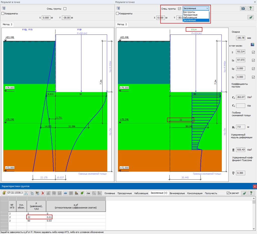 В диалоге "Результаты в точке" добавлен опциональный вывод результатов расчета специфических грунтов, что позволяет посмотреть детали расчета. Например, для расчета усадки набухающего грунта показывается заштрихованный участок эпюры полных напряжений Sz, в котором реализовался расчет усадки до заданной нижней границе зоны усадки Hsh. Для засоленного грунта показывается начальное давление суффозионного сжатия Psf (давление, при котором относительное суффозионное сжатие еsf равно 0.01 - его можно задать в таблице в явном виде самостоятельно или оно будет рассчитано по пропорции от заданных данных).