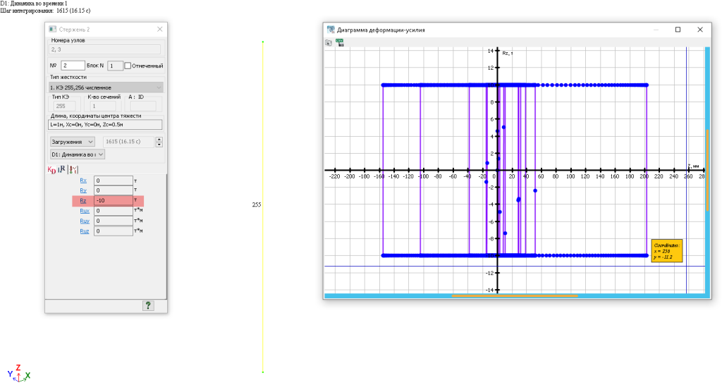 Для анализа усилий в специальных КЭ (51, 55, 56, 251, 252, 255, 256, 261, 262, 265, 266, 263, 264) при расчете на динамические нагрузки и воздействия методом прямого интегрирования уравнений движения в геометрических координатах появилась возможность построения графиков деформации-усилия. Полученные диаграммы можно сохранять в формате CSV.