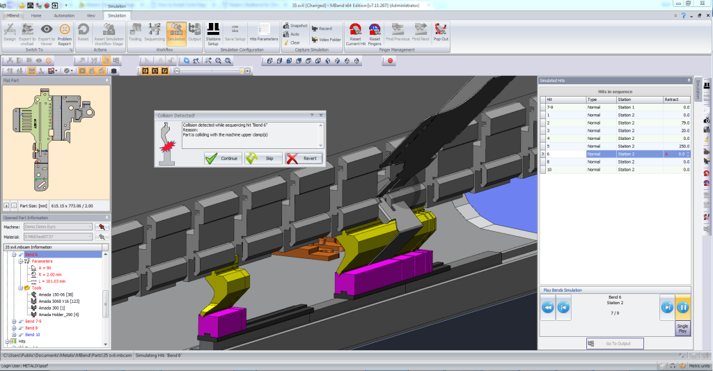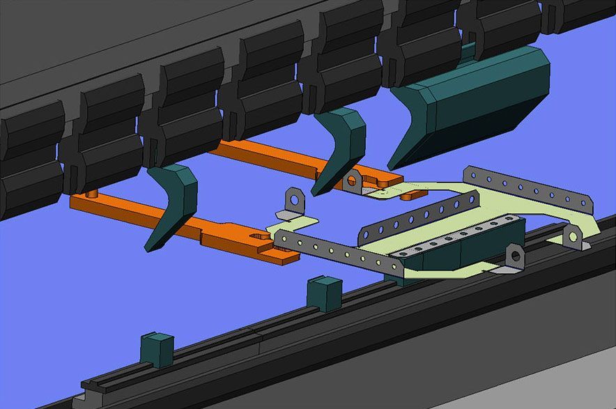 MBend моделирует процесс гибки и производит проверку на столкновения детали со всеми элементами станка, такими как упоры, инструменты, рама станка, а также с самой деталью. Симуляция производится динамически, с отображением перегиба и упругого последействия, а также движения упоров между гибами.