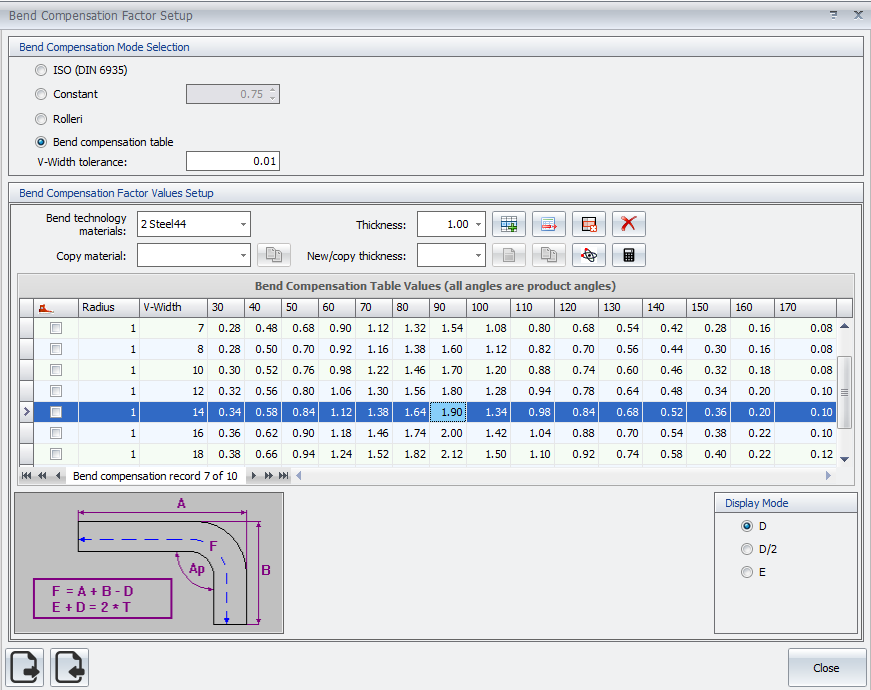 MBend динамически пересчитывает размер развертки в соответствии с выбранными инструментами. Вы можете выбрать один из нескольких методов расчета: таблицу компенсации гибки, ISO, постоянный коэффициент или формулу Rolleri.