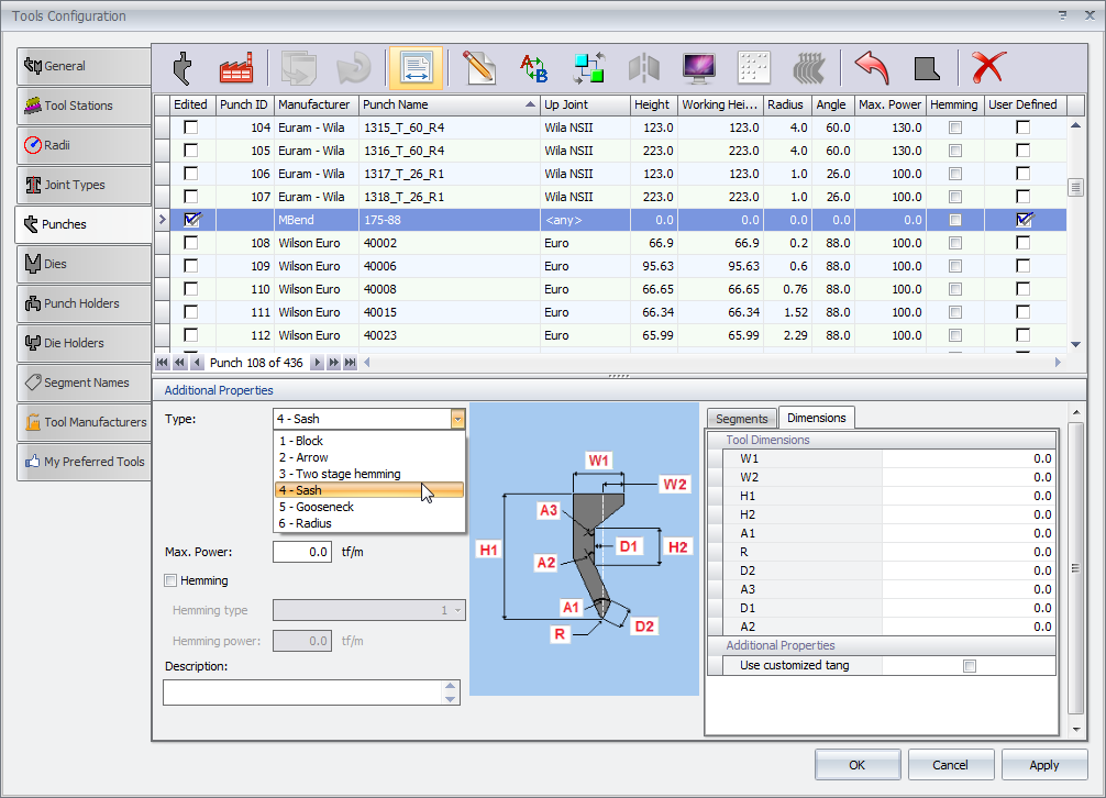 MBend содержит полный каталог марок инструментов. В дополнение вы можете импортировать инструменты и держатели, используя DXF-эскизы, или создавать инструменты, задавая их параметры.