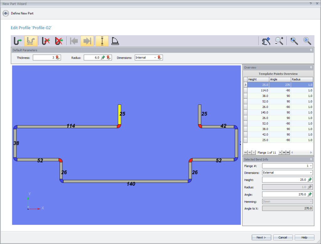Используйте модуль дизайна MBend для создания эскиза профиля детали, уточните значения фланцев и углов, затем сохраните его в библиотеке профилей для дальнейшего использования.