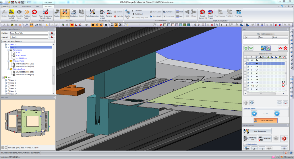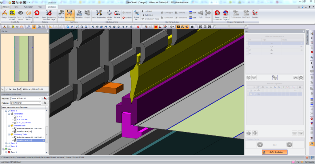 MBend — приложение для программирования и симуляции листогибочных прессов с ЧПУ, позволяющее максимизировать использование производственных ресурсов. MBend позволяет автономно рассчитать параметры инструментов и последовательность гибки, а также выполнить динамическую 3D-симуляцию гибки для избежания столкновений детали с элементами станка.