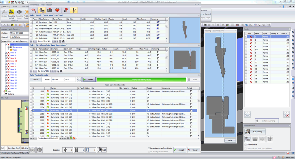 MBend может также производить поиск подходящей последовательности гибки для каждой комбинации инструментов, тестируя ее пригодность для гибки детали.