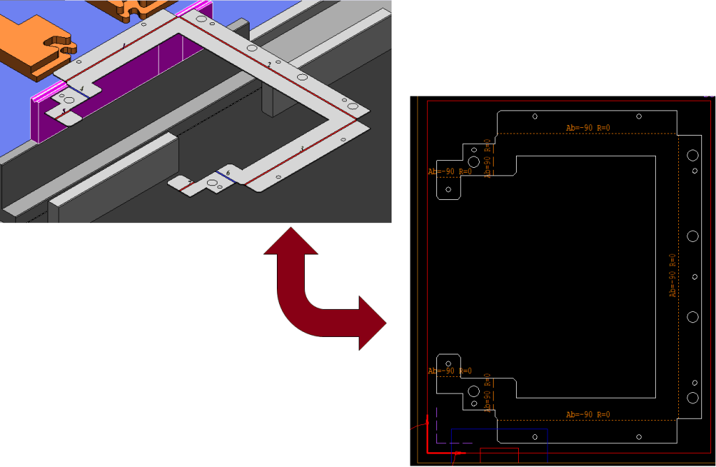 После обработки в cncKad, развертка с отображенными на различных слоях контурами и линиями гибки может быть передана непосредственно в MBend, готовая для гибки.