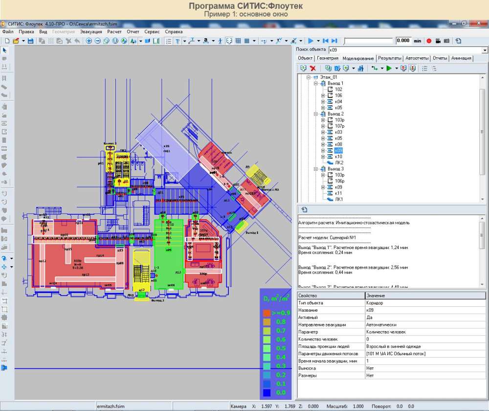 Программа выполняет расчет времени эвакуации из здания согласно положениям Приложения 2, 4 и 5 "Методики определения расчетных величин пожарного риска в зданиях, сооружениях и строениях различных классов функциональной пожарной опасности", утвержденной приказом МЧС России №382 от 30.09.2009, с учетом всех изменений, внесённых в методику, а также расчёта уровня пожарной безопасности по СП 59.13330.2012 "Доступность зданий и сооружений для маломобильных групп населения"