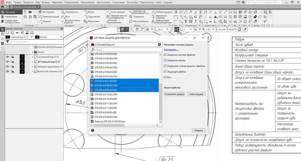 Работа проектировщика в КОМПАС-3D с установленной Системой безопасности практически ничем не отличается от обычной работы. Однако, если включена опция Защищать файлы, любой документ КОМПАС при сохранении будет защищен: последующее его открытие станет возможным только на тех рабочих местах, где установлена Система безопасности, а код, хранимый в ключе, совпадает с кодом, которым защищен файл.